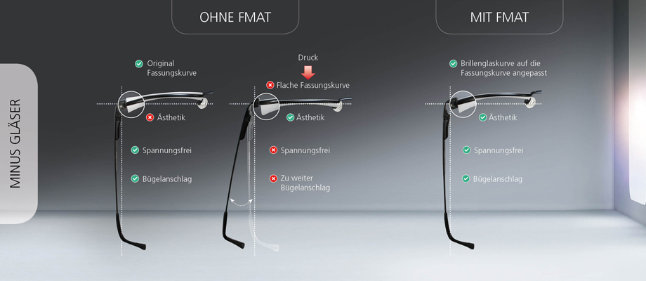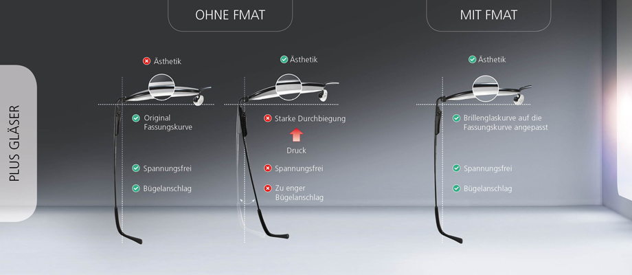 Mit FMAT können Sie bei gleichbleibender optischer Performance die bestmögliche Basiskurve für die ausgesuchte Brille auswählen. Die Basiskurve kann +/- 1.0 dpt. von der automatisch berechneten Basiskurve variiert werden. QUBE kalkuliert das Design aufgrund der gewählten Basiskurve neu. Bei Bestellung ohne FMAT-Angabe wird die Basiskurve von QUBE definiert.